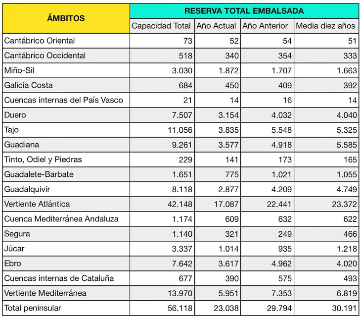 La reserva hidráulica española está al 41,1 por ciento de su capacidad total.Los embalses almacenan actualmente 23.038 hectómetros cúbicos (hm³) de agua, disminuyendo en la última semana en 345 hectómetros cúbicos (el 0,6 por ciento de la capacidad total actual de los embalses).