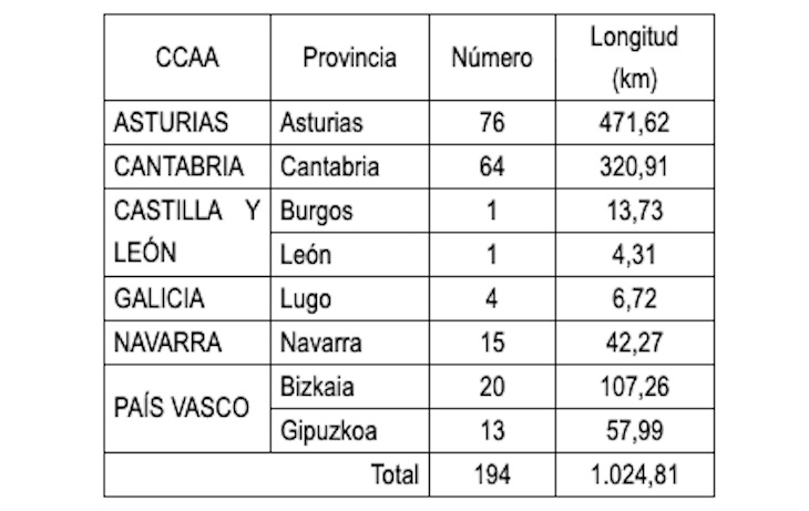 El número y longitud de ARPSIs en el ámbito de competencias de la Confederación tras su revisión es el siguiente: