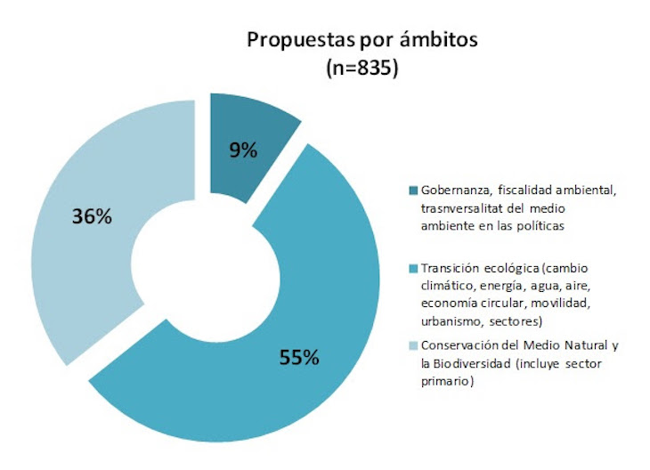 De las 863 propuestas, se han eliminado del análisis aquellas que tienen un efecto directamente negativo para el medio ambiente o para el medio natural o la biodiversidad, quedando una muestra restante de835 propuestas. La transición ecológica está presente en todos los programas, aportando medidas concretas de energía, cambio climático, agua, aire, residuos y economía circular, que equivalen al 55% de las 835 medidas analizadas.