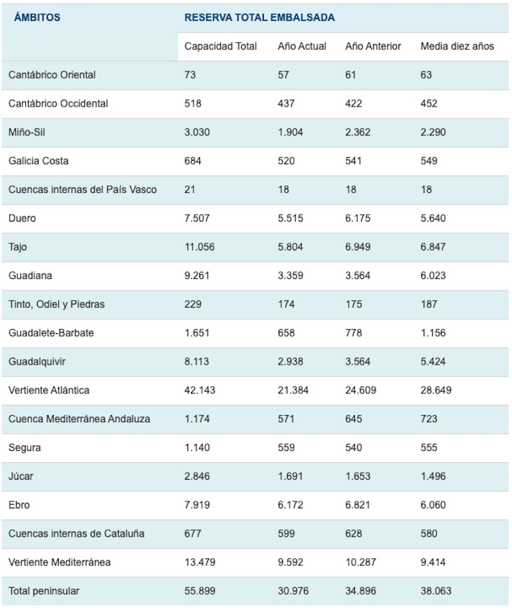 La situación de las cuencas, en hectómetros cúbicos, se detalla en el cuadro adjunto: