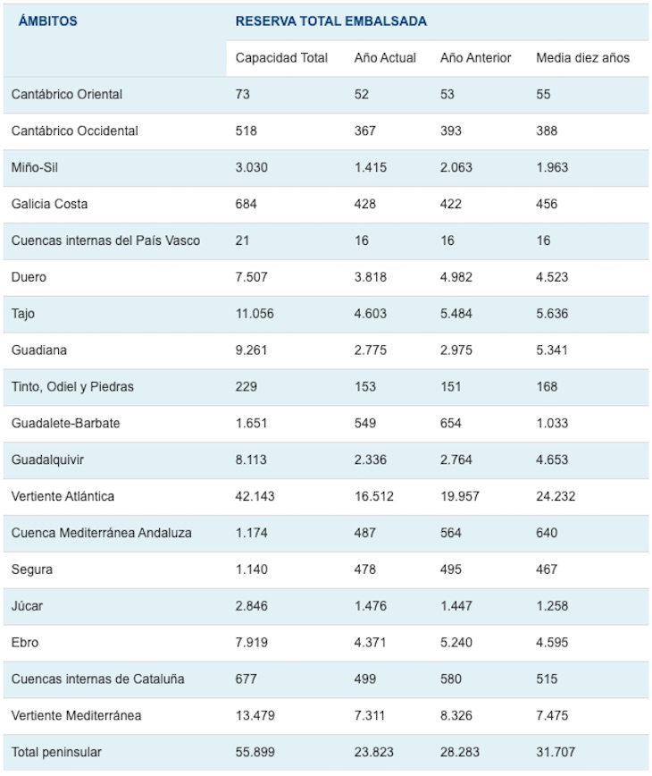 La reserva hídrica española está al 42,6 por ciento de su capacidad total. Los embalses almacenan actualmente 23.823 hectómetros cúbicos (hm³) de agua, disminuyendo en la última semana en 748 hectómetros cúbicos (el 1,3 por ciento de la capacidad total actual de los embalses).