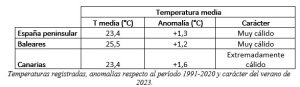 Las temperaturas máximas diarias quedaron en promedio 1,2 °C por encima del valor normal, mientras que las mínimas se situaron 1,4 °C por encima de la media. Por lo tanto, la temperatura media del verano fue 1,3 ºC superior al promedio normal. El cálido verano de 2023 solo fue superado por 2022 y 2003