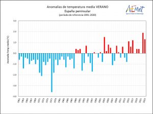 Desde 1961 hasta 2023, la temperatura media en la España peninsular ha aumentado 1,6 ºC. La temperatura de las aguas costeras de España también registraron, entre enero y agosto, su valor más alto desde que hay datos. Superando en 0,5 ºC el anterior registro más cálido, correspondiente a 2020. El cálido verano de 2023 solo fue superado por 2022 y 2003