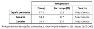 En cuanto a las precipitaciones, se trató de un verano muy húmedo. Se acumularon en la España peninsular 87,2 mm, valor correspondiente al 124 % respecto al promedio normal.