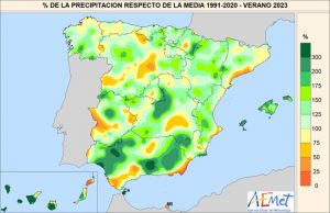 El verano tuvo carácter entre normal y húmedo en casi toda la Península. Únicamente fue seco en puntos dispersos de la Península y algunas zonas costeras de Cataluña.
