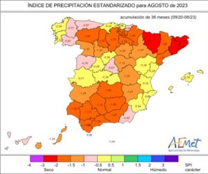 También existe una sequía meteorológica de larga duración, es decir, teniendo en cuenta las lluvias de los tres años anteriores, para el conjunto de la España peninsular y en todas las cuencas de acumulación salvo las del Júcar, Segura y Tajo.