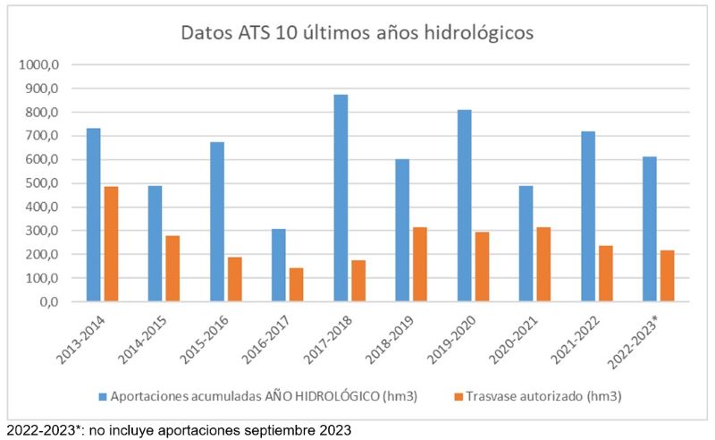 Durante el presente año hidrológico 2022-2023, que comenzó el pasado 1 de octubre de 2022 y finalizará el próximo 30 de septiembre de 2023, se habrá autorizado el trasvase de 218 hm³ desde la cuenca del Tajo hacia las cuencas del Guadiana y del Segura. Analizando los últimos diez años hidrológicos, a través del acueducto Tajo-Segura se habrá autorizado la derivación de un total de 2.647,2 hm³, si bien cada uno de los trasvases aprobado a lo largo de estos años se ha hecho en función de la situación hidrológica existente.