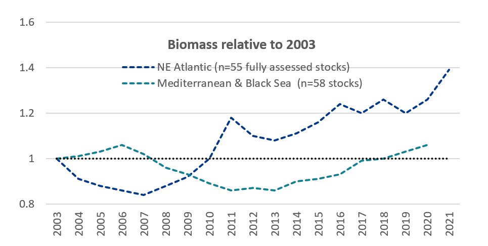 Oceana celebra la recuperación de las pesquerías de la UE. El informe revela una tendencia ascendente positiva en la biomasa de las poblaciones de peces del Atlántico nororiental a lo largo de los años, desde 2007 a la fecha.