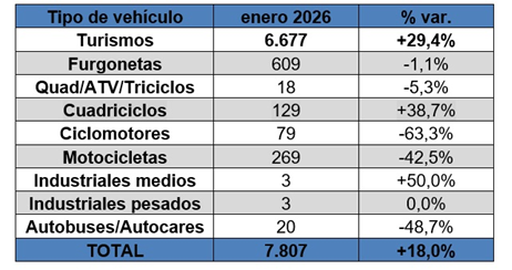 Las matriculaciones de vehículos totalmente eléctricos aumentaron un 18% en enero, alcanzando las 7.807 unidades. Estas cifras están impulsadas principalmente por la venta de turismos, cuatriciclos y vehículos comerciales medianos.