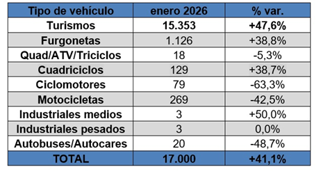 Las matriculaciones de vehículos electrificados (100% eléctricos + híbridos enchufables) de todo tipo (turismos, dos ruedas, comerciales e industriales) arrancaron 2026 con una subida del 41%. Hasta alcanzar las 17.000 unidades, Según datos de la Asociación Empresarial para el Desarrollo e Impulso de la Movilidad Eléctrica (AEDIVE) y la Asociación Nacional de Vendedores de Vehículos (GANVAM).