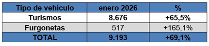 Por su parte, los vehículos híbridos enchufables registraron un incremento del 69% en enero, hasta alcanzar las 9.193 unidades. A la vista de los datos, el 21% de las matriculaciones de turismos registradas en enero correspondieron a modelos electrificados (puros + híbridos enchufables).