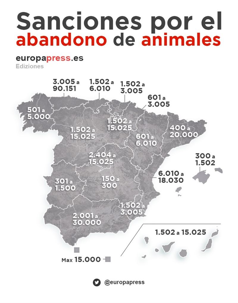 ISLAS BALEARES: La ley es de 1992 y contempla dos tipos de abandono. Por una parte el abandono no reiterado de un animal es visto como grave y la multa puede ir de 300 euros a 1.502 euros; y por otra, el «abandono de animales de compañía, domesticados o salvajes en cautividad, o el reiterado aunque sea individualizado» se considera muy grave con una multa que va desde 1.502 hasta 15.025 euros.