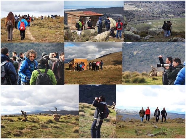 Figura 2. Collage de instantáneas tomadas durante la visita a la Reserva de la Biosfera de El Espinar Real Sitio de San Ildefonso (Segovia). Se observa a los estudiantes de la Escuela de Capacitación Forestal realizando la ruta o itinerario ambiental, visitando el observatorio de aves y el hide fotográfico, realizando fotografías y observando las aves a simple vista, con prismáticos y con telescopios, charlando y debatiendo sobre el interés de los PAS y su funcionamiento y finalmente una vista panorámica del muladar.