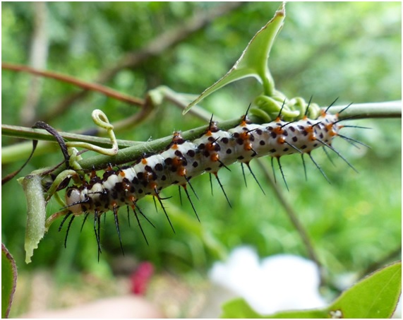 Las hembras ponen sus huevos en las plantas de la pasionaria, un género de enredaderas tropicales con una variación extrema en la forma de sus hojas, dentro de las especies. Por ejemplo, estas plantas pueden tener hojas de forma triangular, alargada, elíptica, lobulada o lanceolada.
