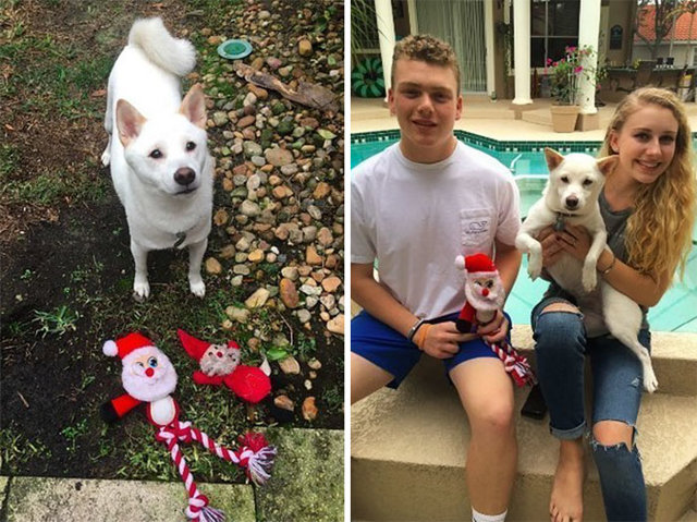 Los que tienen perros con tendencias obsesivas por algunos juguetes sabrán que vayan donde vayan, estén donde estén, su juguete favorito siempre los acompaña. «Kya lleva a todas partes su juguete de Santa…Cada vez que nos sentamos en el sofá para ver la tele ella se acerca con su juguete y lo lame», dijo John, uno de sus dueños, a Bored Panda.
