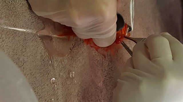 La operación duró 30 minutos y se llevó a cabo en una mesa de operaciones especialmente adaptada con un equipo de micro cirugía y sobre una hoja impermeable con agua para mantenerlo hidratado.