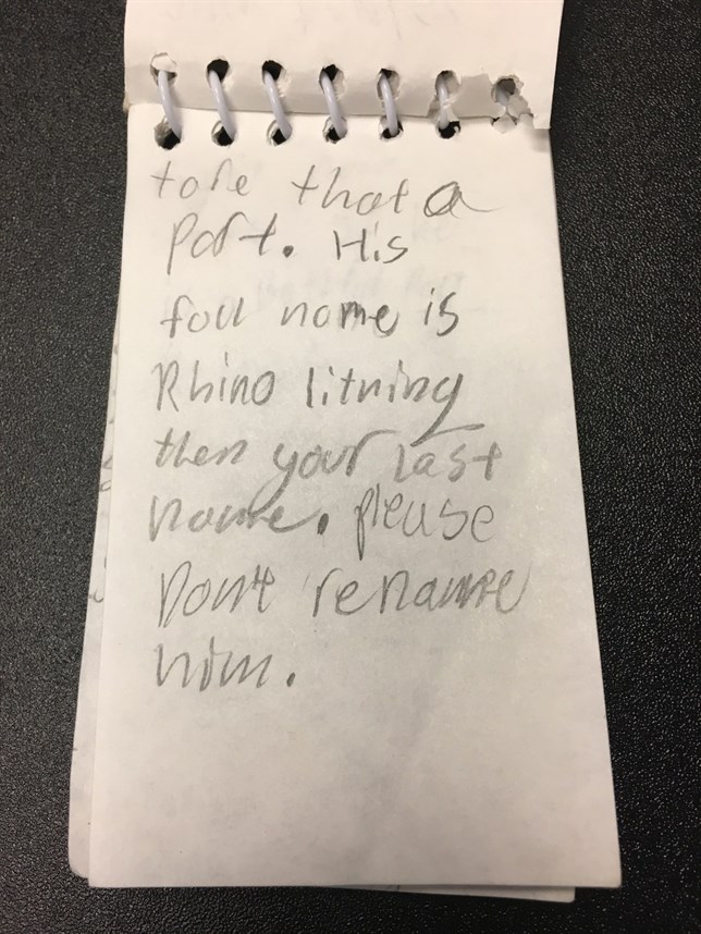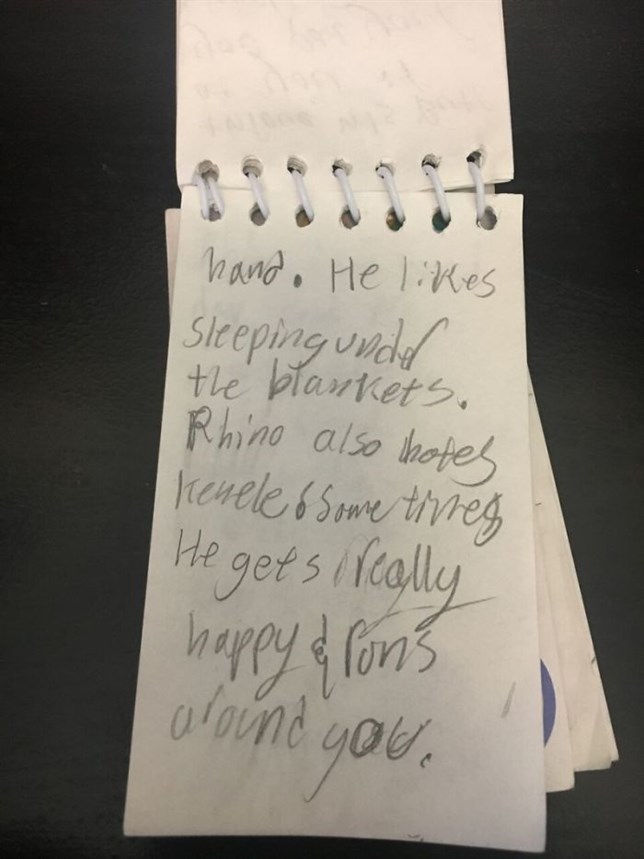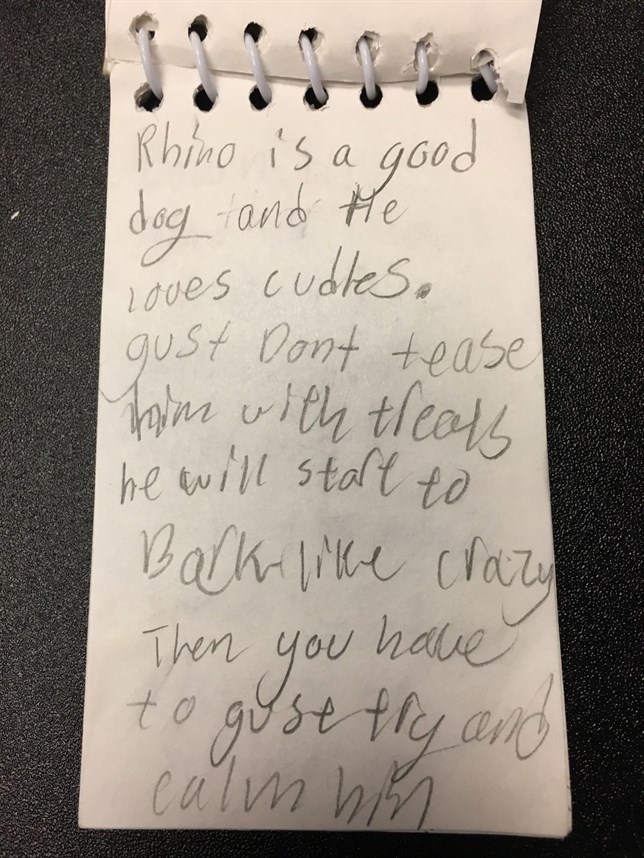 Tras unos meses conviviendo con la familia, se dieron cuenta de que Rhino no acaba de encajar en ella: era demasiado activo para unos niños tan pequeños. Así que decidieron devolver el perro al refugio, pero quisieron ayudar a Rhino a encontrar un hogar permanente rellenando un cuaderno de notas con los siguientes mensajes: