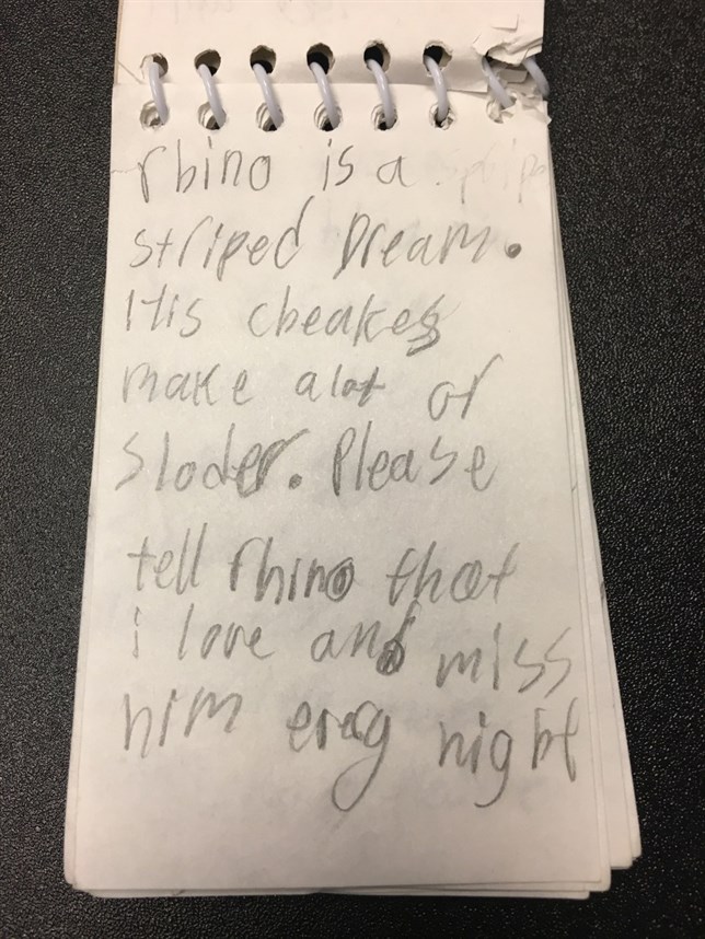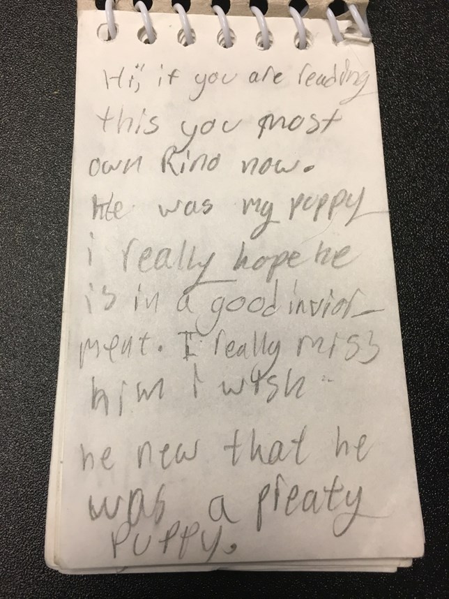«Hola, si estás leyendo esto, debes poseer Rhino ahora. Era mi perrito. Realmente espero que esté en un buen ambiente. Realmente lo extraño. Ojalá supiera que era un lindo perrito.