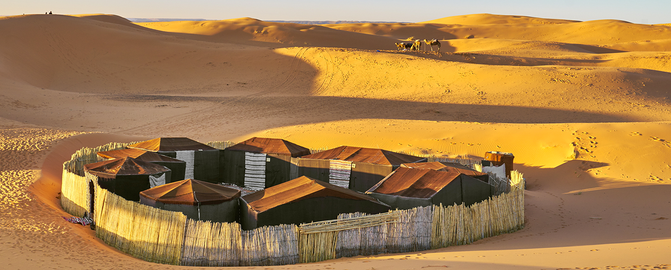 Para dormir en el Sáhara marroquí se puede viajar a la ciudad de Merzouga y, de ahí, recorrer el desierto en todoterreno o en camello. A pesar de que asociemos el desierto con calor, el frío también es un elemento adverso, especialmente a la hora de dormir, ya que las temperaturas pueden bajar hasta los 2 ºC en invierno. Sin embargo, contemplar el amanecer entre las dunas bien merece pasar un poco de frío.