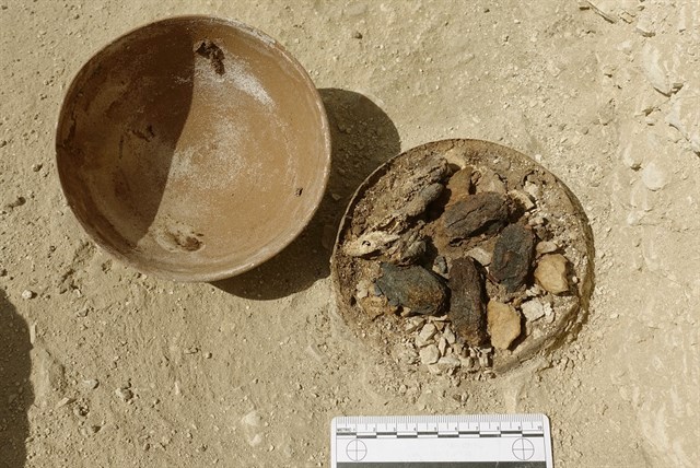 Junto al jardín y al tamarisco, los investigadores también han descubierto un cuenco de cerámica cuyo contenido –unos dátiles secos y otras frutas que podrían haber sido presentados como ofrendas– también se encontraba en «perfecto estado». «Daban ganas de hincarle el diente», ha bromeado Galán.