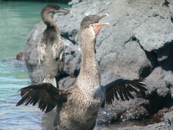El cormorán mancón o cormorán de las Galápagos (Phalacrocorax harrisi), con sus alas cortas y escamosas, es el único de 40 las especies de cormoranes que no pueden volar. Es también el más grande y un nadador potente que se zambulle para sus capturas de pescado.