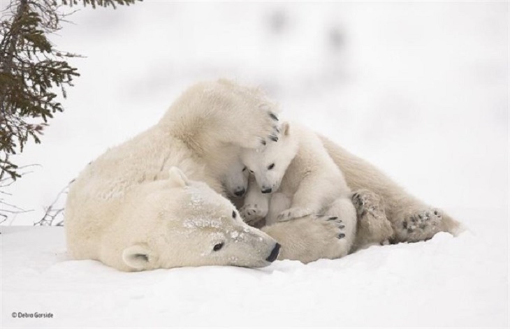 La canadiense Debra Garside esperó seis días cerca de la guarida de una familia de osos polares para poder captarlos con su cámara. Cuando las madres y los cachorros de osos polares salen de sus madrigueras a principios de la primavera, los cachorros se quedan cerca de sus madres en busca de calor y protección. Una vez que los cachorros son fuertes y tienen suficiente confianza, inician la caminata hacia el hielo marino con su madre para que poder volver a buscar focas.