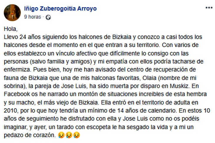 Poco después, Iñigo Zuberogoitia informaba de que no era “un halcón cualquiera”, sino que se trataba de Olaia: