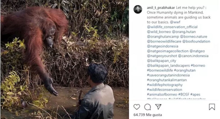 El momento en que un orangután tiende su mano para sacar del río a un guarda forestal que parecía atrapado fue capturado por casualidad, cuando el fotógrafo aficionado Anil Prabhakar se encontraba en un safari en Borneo.