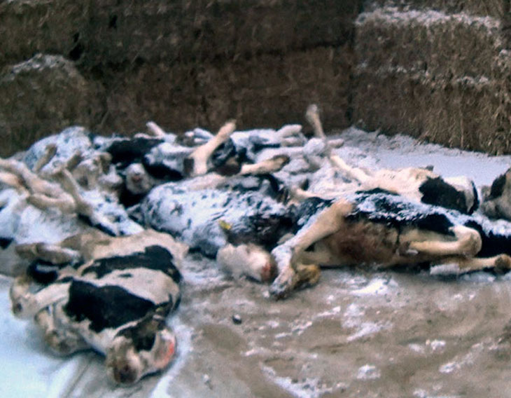 - Vacas aún vivas apiladas sobre cadáveres.