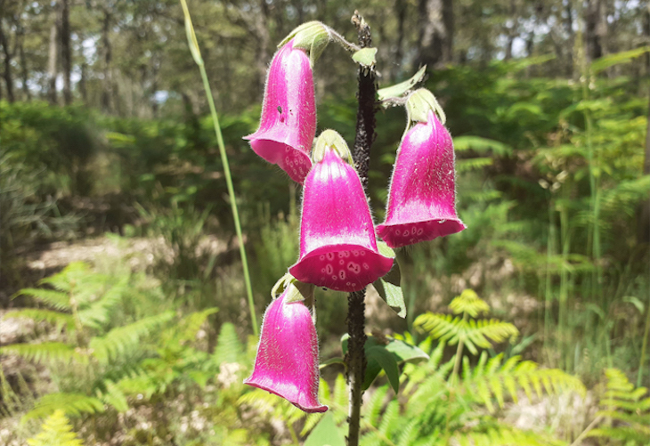 Dedalera o digital (Digitalis purpurea): Aparece en claros de bosque, caminos y entornos rurales. Es una planta bienal, crece en dos años y tiene cierta toxicidad, se utiliza en la fabricación de fármacos y se ha usado para tratar problemas cardiacos. Puede alcanzar un metro de altura.