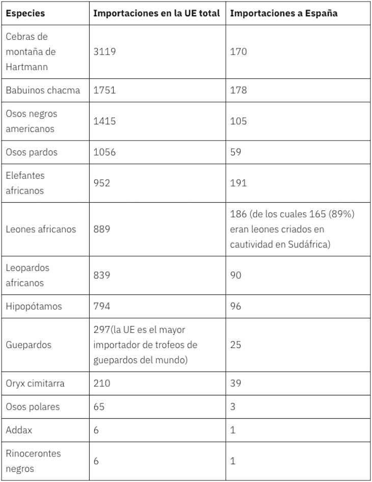 Casi todos (89%) los trofeos de león importados por España procedían de animales en cautividad, originarios exclusivamente de Sudáfrica. España fue también el tercer mayor importador de trofeos de una especie notable, el leopardo africano, del que unos 90 fueron matados en la naturaleza. Otras especies notables de trofeos importados por España durante este periodo son el guepardo (del que España es el quinto mayor importador de la UE), el oso polar, el hipopótamo, el babuino y la morsa.