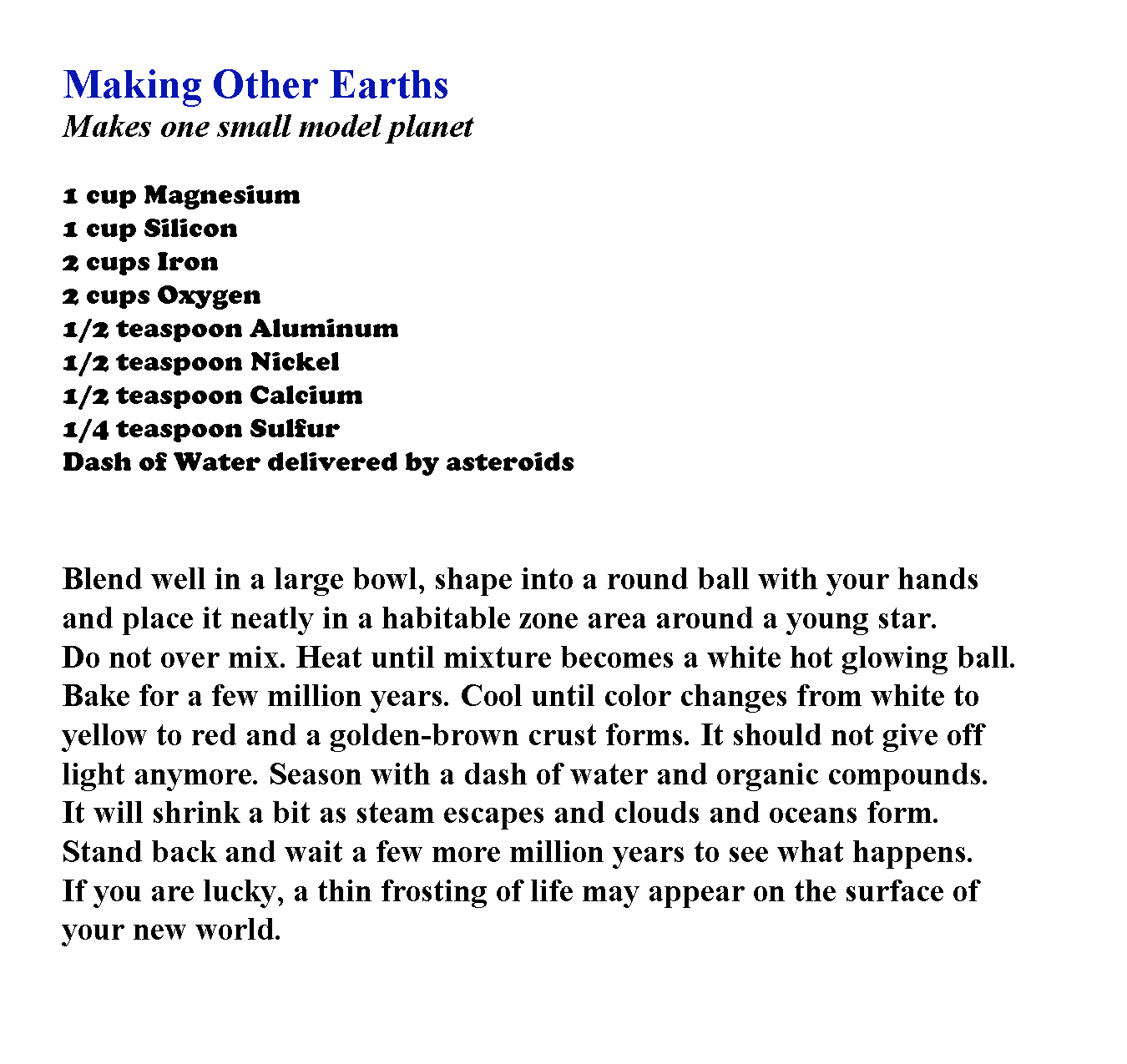 Luego, hay que «hornear durante unos pocos millones de años. Enfriar hasta que los cambios de color de blanco a amarillo y a rojo den forma a una costra dorada y marrón. No debe emitir más luz. Sazonar con una pizca de agua y compuestos orgánicos. Se encogerá un poco por los escapes y la formación de nubes de vapor y océanos. Entonces habrá que hacerse a un lado y esperar unos cuantos millones de años para ver qué pasa. Si tienes suerte, un fino glaseado de vida puede aparecer en la superficie de tu nuevo mundo«.