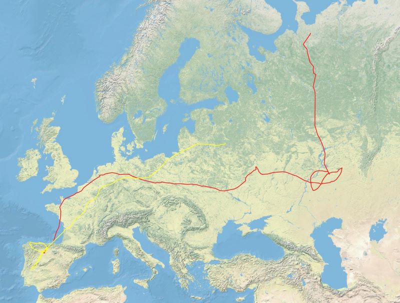 Un viaje de unos 3.000 km que la llevó a Rusia, cerca de la frontera con Bielorrusia, donde supuestamente crio en verano 2022. En su migración, viajó por Francia, Bélgica, Alemania, Polonia, Lituania y Bielorussia, hasta llegar a Rusia.