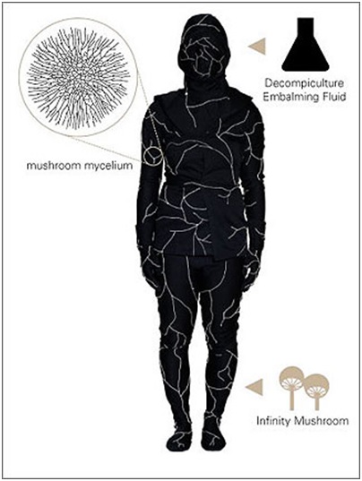 La idea es cubrir el cuerpo con un traje mortuorio especial, que a su vez recubre una capa de un hongo que es capaz de descomponer todos los tejidos humanos (incluso el cabello y las uñas) sin residuos tóxicos, por lo que luego de un tiempo de estar enterrado, se convertirá en parte de la naturaleza nuevamente.