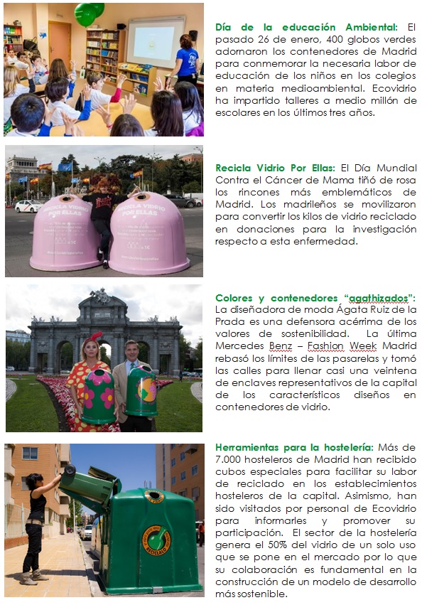 - El Ayuntamiento de Madrid y Ecovidrio despliegan una ambiciosa acción de buzoneo de bolsas de reciclaje y material informativo para facilitar la tarea de la separación del vidrio a los ciudadanos.