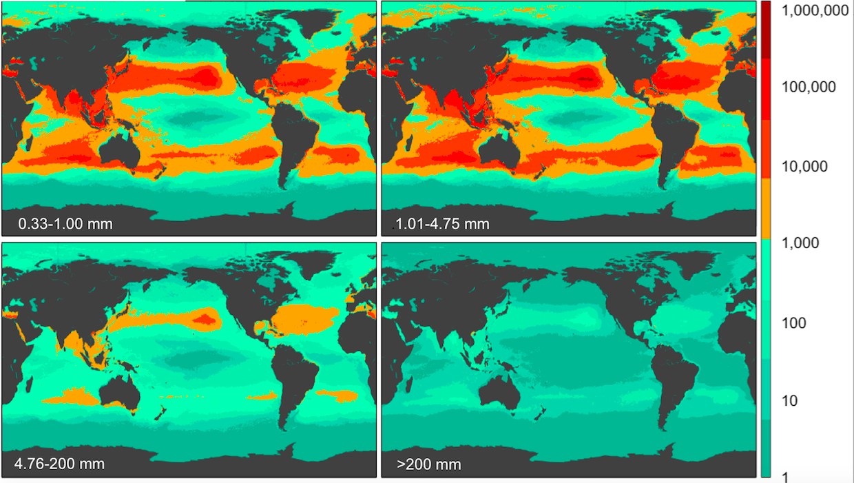 Densidad de los plásticos a nivel mundial para cada una de las cuatro clases de tamaño (de 0,33 a 1,00 mm, de 1,01 a 4,75 mm, de 4,76 a 200 mm, y >200 mm)