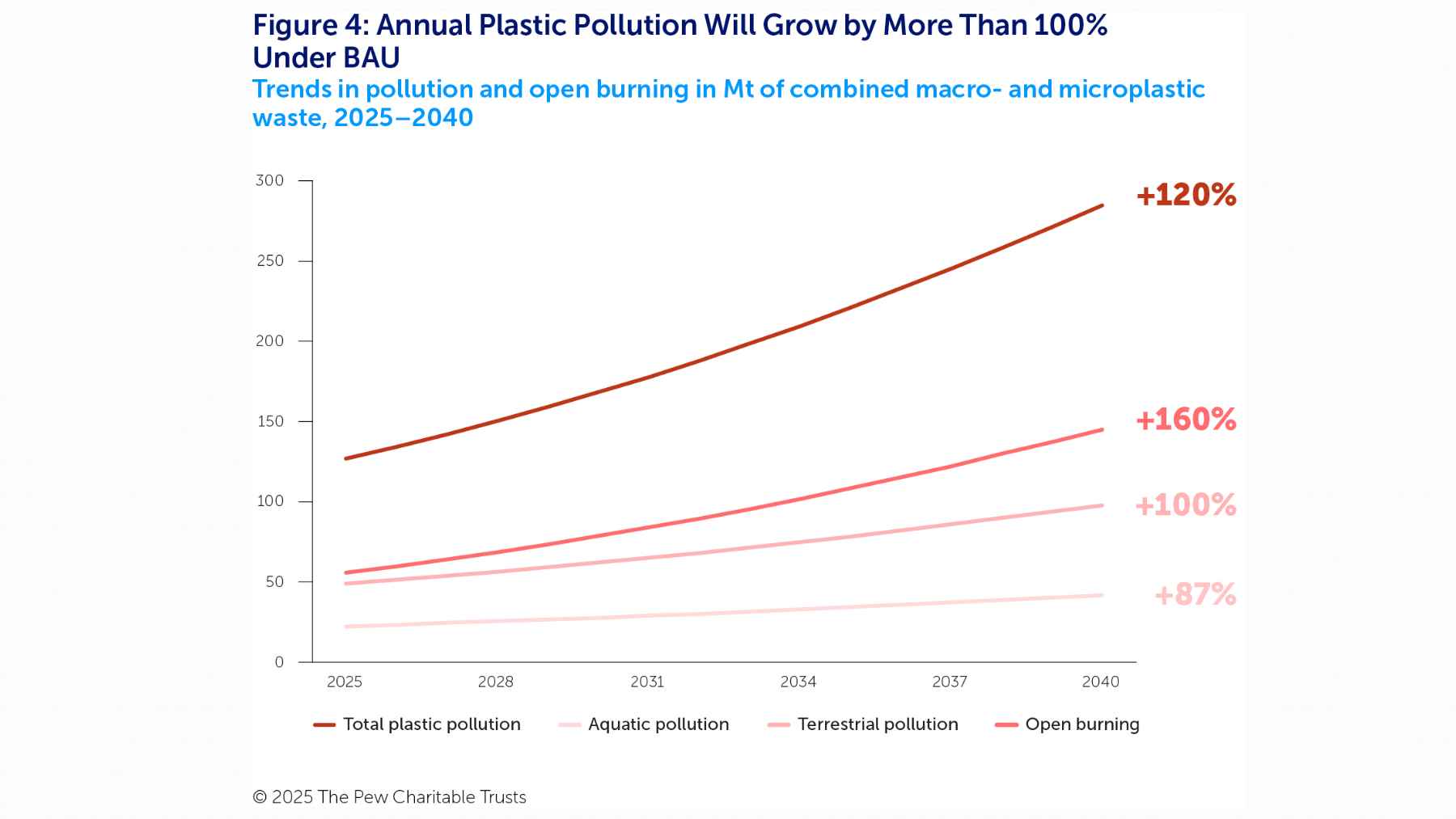 El informe “Rompiendo la ola de plástico 2025” advierte que, sin medidas, la contaminación plástica crecerá más del 100 % en 15 años (The Pew Charitable Trusts).