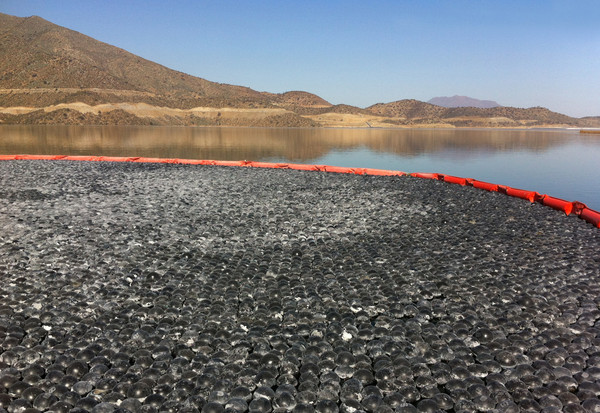 En California, donde se han desplegado 96 millones de bolas en reservas naturales de agua, se investiga el camino inverso: usar la tecnología para el agua potable y, de ahí, exportarla al sector minero. Aunque otras diferencias lo separan del proyecto chileno: el principal objetivo del departamento de Aguas y Energía de Los Ángeles (LADWP) a cargo del proyecto es detener la llegada de la luz solar, que podría ocasionar una peligrosa reacción química entre el bromuro de los canales subterráneos del agua y el cloro que se usa para desinfectarla. La exposición de la luz solar sobre estos compuestos genera bromato, un elemento en la lista de sospechosos por ser potencialmente cancerígeno.