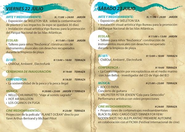 Entre las actividades que se desarrollarán en la Fundación Sales, destaca la exposición de los artistas Skeleton Sea sobre contaminación de plástico (que se quedará 30 dìas) y la instalación artística creada por la Fundación Vigo Convention Bureau para la promoción del Parque Nacional de las Islas Atlanticas. Durante los dos días tendrá lugar el taller para niños “ReuSonica” que persigue el fin de concienciar a los más pequeño sobre la contaminación de los océanos y durante el cual se construirán instrumentos musicales con los desechos recuperados durante la limpieza de la playa (realizada a principio de julio en colaboración con la escuela de surf “La conservera del surf” y con Cerveza Salada).
