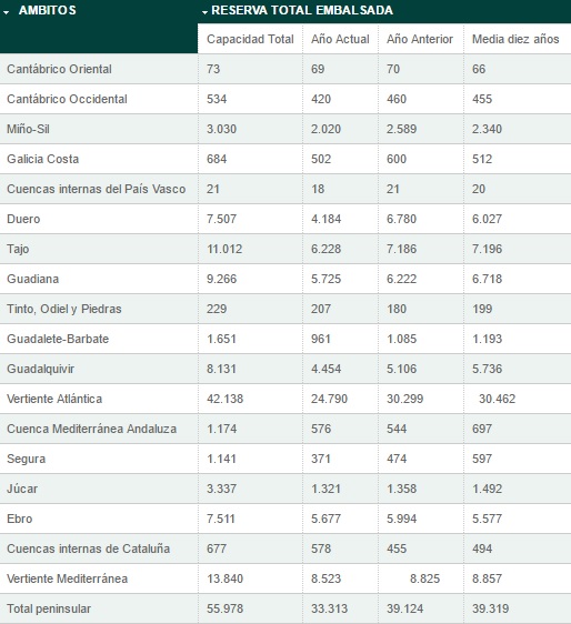 La reserva hidráulica española está al 59,5% de su capacidad total. Los embalses almacenan actualmente 33.313 hectómetros cúbicos (hm³) de agua, aumentando en la última semana en 10 hectómetros cúbicos.