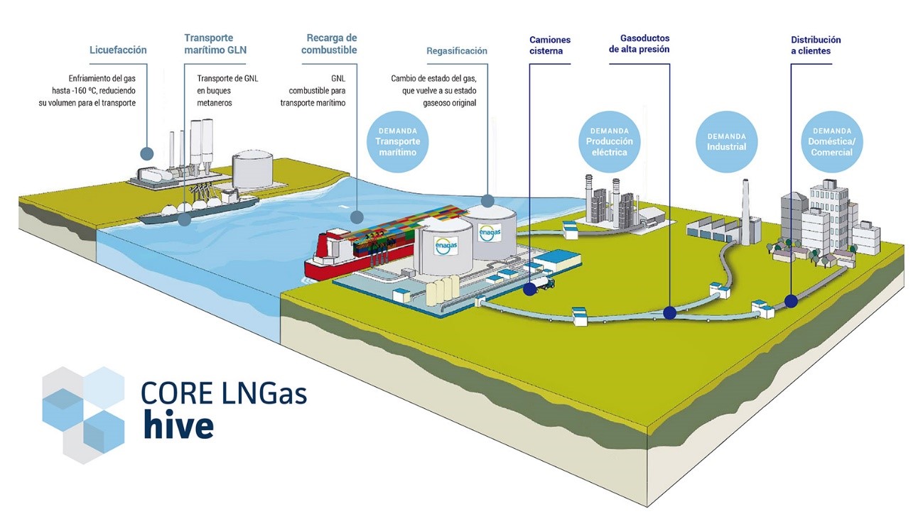 Los estudios y trabajos relevantes relacionados con el establecimiento de instalaciones de GNL a pequeña escala se están llevando a cabo a través del proyecto europeo Core LNGas Hive, que también involucra a los principales puertos españoles.