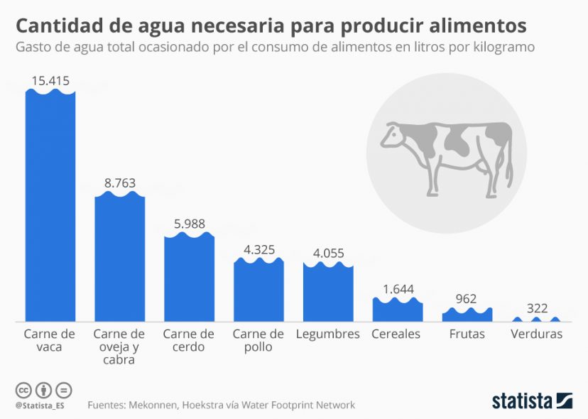En datos prácticos, esto significa que el agua que se gasta en 100 duchas equivale a la que se necesita para la producción de un solo kilo de carne. Dicho de otra forma, dejando de comer un kilo de carne estaríamos ahorrando 15.000 litros de agua, que es la que se gasta en 100 duchas.
