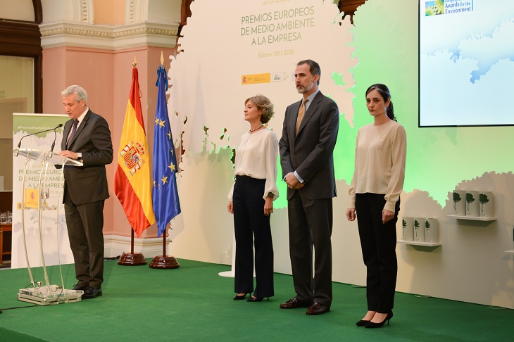 Su Majestad el Rey ha presidido hoy el acto de entrega de los Premios Europeos de Medio Ambiente a la Empresa, en su Sección Española, que en esta edición 2017/2018 otorga el Ministerio de Agricultura y Pesca, Alimentación y Medio Ambiente, a través de la Fundación Biodiversidad.