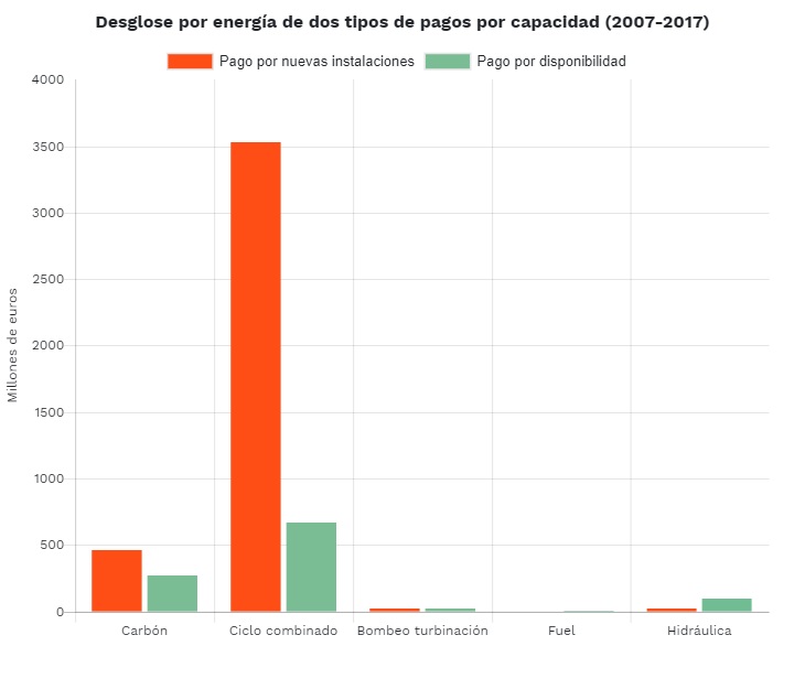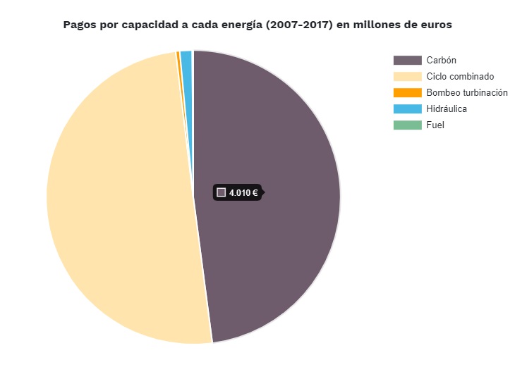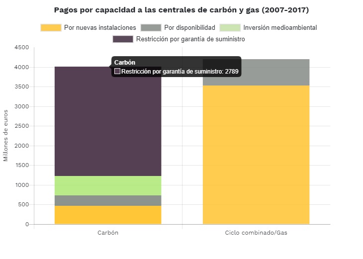 Teniendo en cuenta los cuatro tipos de pagos por capacidad (inversión por nuevas instalaciones, pago por disponibilidad, incentivo medioambiental y restricción por garantía de suministro), hemos pagado 8.368.393.912 € entre 2007 y 2017 en nuestra factura de la luz, supuestamente para garantizar el suministro eléctrico.