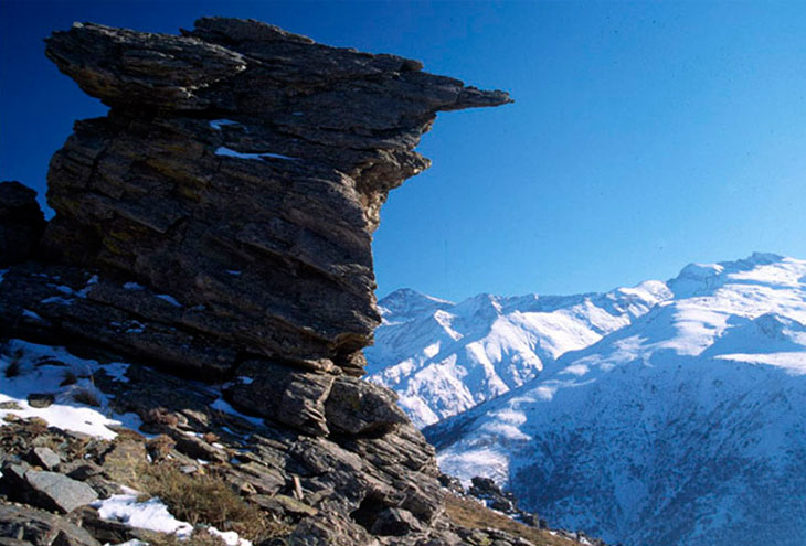 El macizo de Sierra Nevada, enclavado en la parte central de la Cordillera Bética, constituye el territorio con mayor biodiversidad y presencia de especies endémicas de la flora en España. Sus ecosistemas de alta montaña, bosques caducifolios y matorrales mediterráneos acogen alrededor de 2.300 especies de plantas, 80 de ellas exclusivas. Con más de veinte cumbres por encima de los 3.000 metros, Sierra Nevada incluye también el pico más alto de la Península Ibérica, el Mulhacén (3.479 metros).