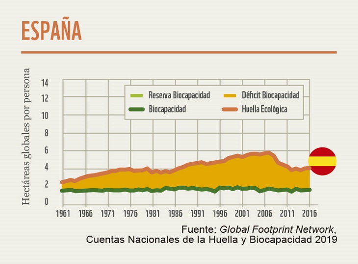Al ritmo de consumo de un ciudadano español medio, necesitaríamos 2,3 planetas para satisfacer nuestra demanda de recursos. En 2016 (último año con datos disponibles), España tenía una huella total de 4,04 hag (hectáreas globales por persona) y nuestra biocapacidad era de 1,37 hag, por lo que contamos con un déficit ecológico de 2,67 hag.
