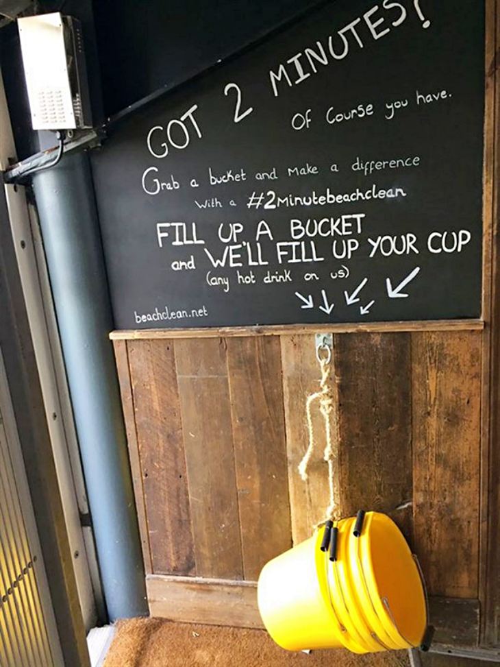 Esta cafetería ofrece bebidas calientes a todas aquellas personas que traigan un cubo de basura recogida de la playa colindante.