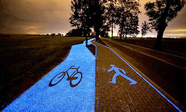 Este carril para bicis de Polonia que se carga con la energía del sol para brillar en la oscuridad.
