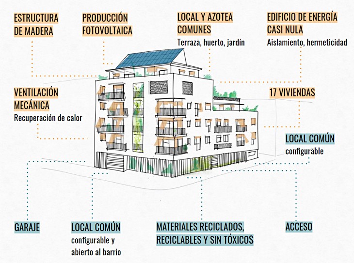 El proyecto tiene un plazo de ejecución de entre 2 y 3 años y consta de 17 viviendas de 1, 2 y 3 dormitorios y una superficie edificable de 1.595 m2, de los cuales, el 20% irá destinado a uso común de los vecinos y vecinas. Dispondrá de corralas para el acceso a las viviendas, un patio y soportal comunes; y una gran azotea compartida.