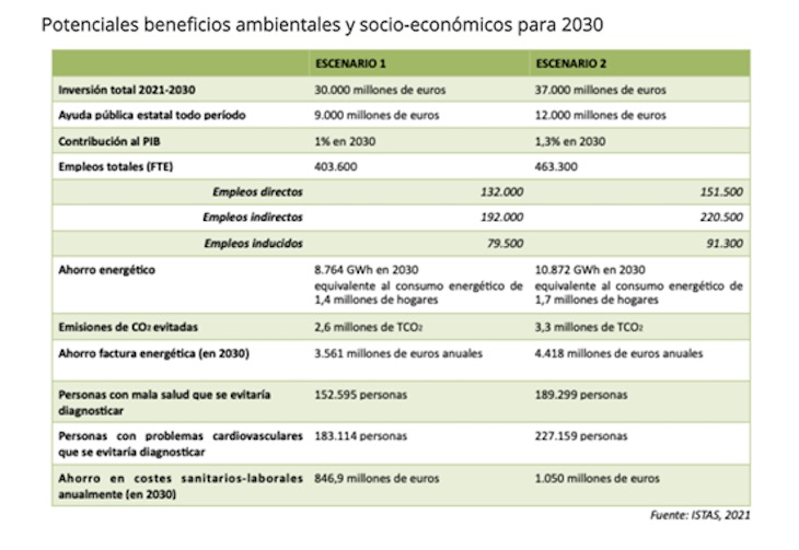 Además, generaría un ahorro energético anual total de 8.764 GWh en 2030, equivalente al consumo energético de 1,4 millones de hogares y elevaría la reducción de emisiones anuales a 2,6 millones de toneladas de dióxido de carbono en el mismo año. Se daría además un ahorro en costes sanitario-laborales anuales de 846,9 millones de euros anuales por la mejora de condiciones de vida y la reducción de diversas patologías